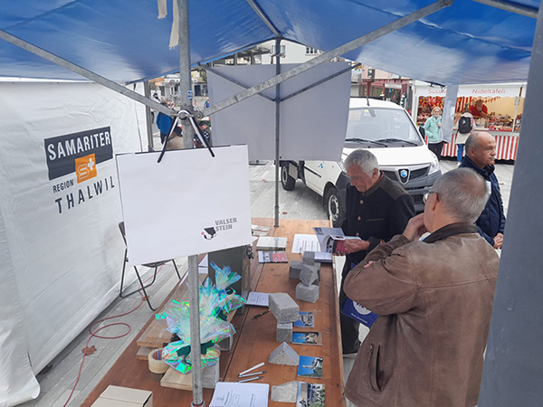 Ebenso auf Interesse stiess der vom VVT durchgeführte Wettbewerb. Es galt zu schätzen, wie viele Tonnen Valser Quarzit auf dem Platz verlegt worden waren. Die Meinungen gingen weit auseinander: Eingereicht wurden Zahlen von 3 bis 300'000 Tonnen. Die Lösungszahl lautet dann aber 228 Tonnen. Mit 225 Tonnen am nächsten kam Elsa Frei vom Thalwiler Oberdorf. Sie und zwei weitere Teilnehmende mit ebenfalls sehr nahen Schätzungen gewannen eine Platte aus roh gebrochenem Valser Quarzit, belegt mit einem Birnbrot vom Köllibeck.
