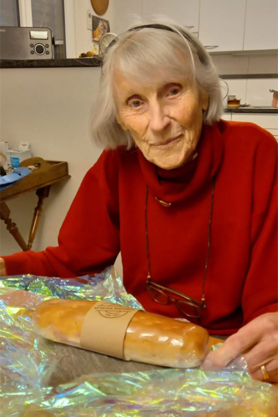 Die glückliche Gewinnerin Elsa Frei (95) beim Auspacken des Preises. "Wie fein. Birnbrot mag ich besonders gerne!"