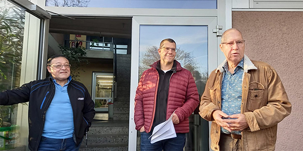 Vor der Führung begrüsste René Huber, Präsident des Verschönerungsvereins, die Gäste. In der Mitte Jan Adams, Leiter Werke, links Alen Molina, Betriebswart des Seewasserwerks TRKL. Das Kürzel steht für die der Anlage angeschlossenen Gemeinden Thalwil, Rüschlikon, Kilchberg und Langnau.