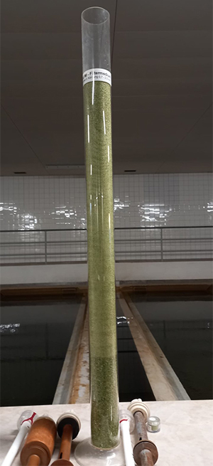Der Reinigungsprozess beginnt. Oben die Sickerbecken, unten die Füllhöhe des darin befindlichen Filtersandes. Die Säule misst fast einen Meter.