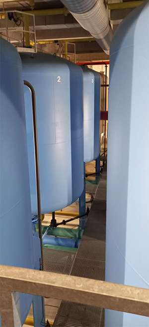 In diesen riesigen Tanks wird das aufbereitete Wasser zusätzlich durch Aktivkohle gepresst. Danach ist es konsumbereit.